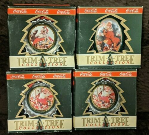 Title (ebay affiliate link): 4 VINTAGE SANTA CLAUSE COCA-COLA ADS TRIM A TREE CHRISTMAS ORNAMENTS