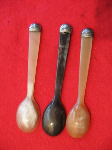 3 VINTAGE w/silver tips STEER / COW / BUFFALO ? HORN SPOON nice
