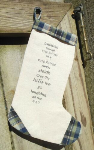 Title (ebay affiliate link): Primitive Christmas Stocking printed "Dashing Through The Snow, In a One" etc.