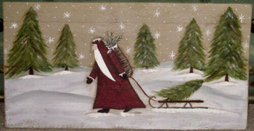*~*PRIMITIVE*~* HP FOLK ART BELSNICKLE SANTA * SLED * TREES *~* RECLAIMED WOOD