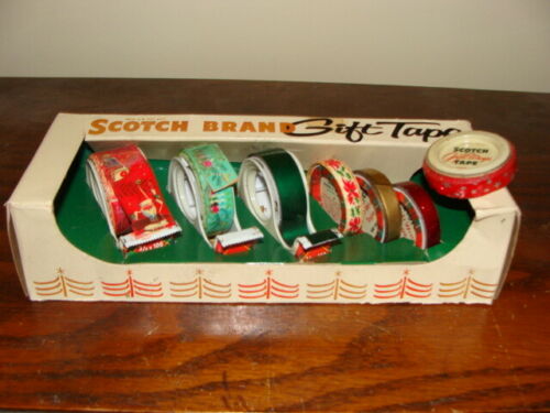 Title (ebay affiliate link): Vintage Advertising SCOTCH BRAND GIFT TAPE Boxed Set 3 Tin Dispensers 4 Rolls