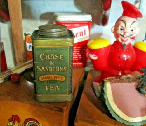 Title (ebay affiliate link): VINTAGE CHASE & SANBORNS TEA CONTAINER METAL TOP & BOTTOM