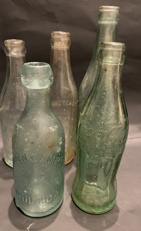 Title (ebay affiliate link): ANTIQUE SODA & BEER BOTTLE LOT(5) W/BLOB TOP PHILLY~NEUNSINGER BEER~COCA COLA~GU