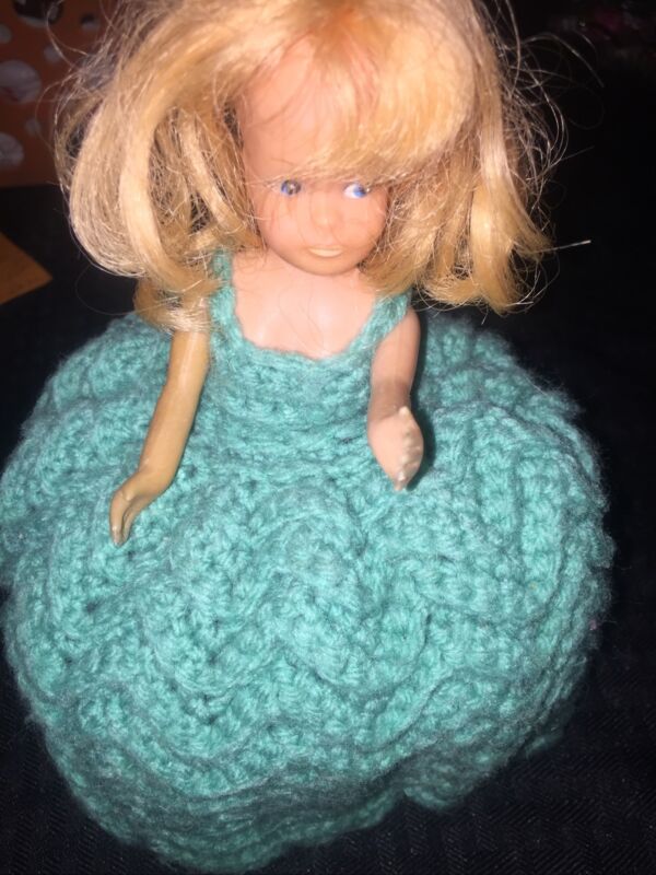 Vintage BlondeHair Doll Toilet Paper Cover Crochet Green Dress Cute!