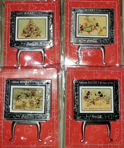 Title (ebay affiliate link): Disney Seasons Greeting 75 Years Fun Mickey Coca Cola Easel 4 PIN SET MOC