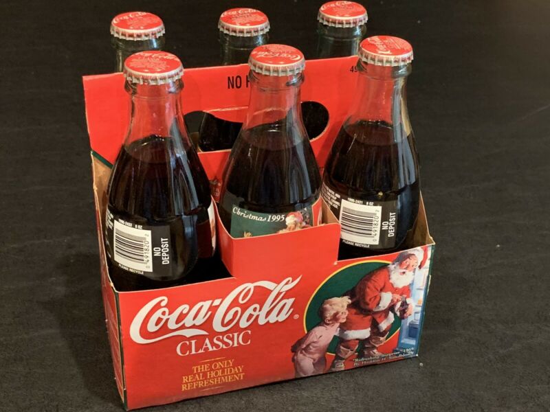 Title (ebay affiliate link): Christmas 1995 Santa Claus Coca Cola Classic Full Bottles 6 Pack with Holder
