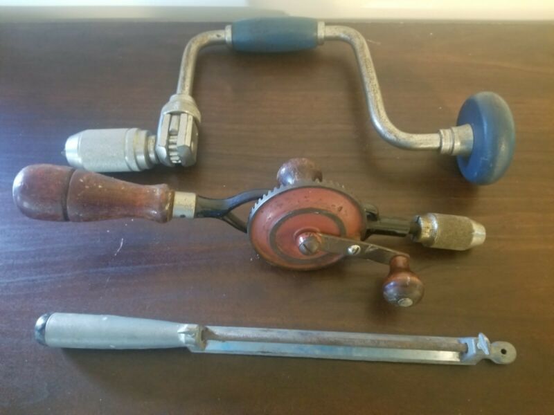 Title (ebay affiliate link): VINTAGE USED WOOD HANDLE CRAFTSMAN & TRUTEST HAND DRIVER DRILL TOOL LOT W/ FILE