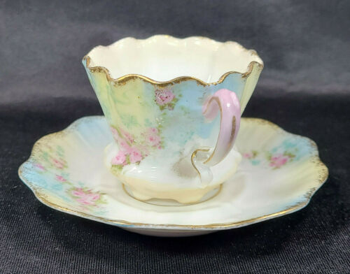 Antique RS Prussia Demitasse Teacup & Saucer Gold Ruffles Pink Roses Early 1900s