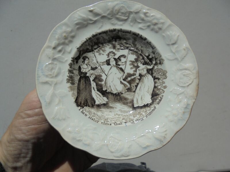 Antique 19th C Brown Transferware Child''s Plate Saucer Girls Soared in the Swing