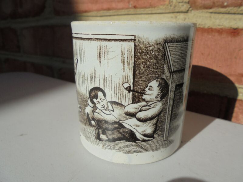 Antique 19th C Brown Transferware Mug w Children Playing Reading Smoking