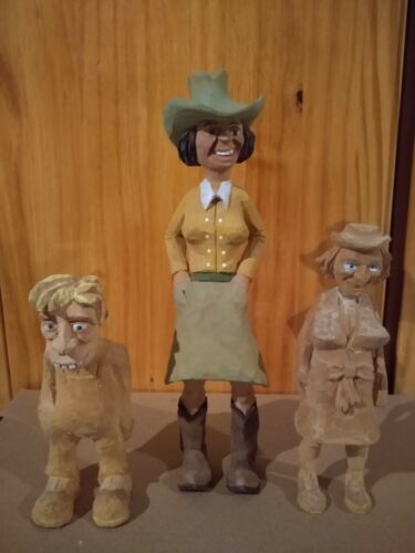 3 hand carved cowboy hillbilly Western figures - buck tooth kid
