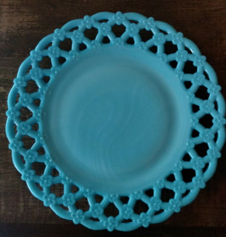 Title (ebay affiliate link): Rare Westmoreland 1940 Forget Me Not Flower Open Lace Edge Plate Blue Milk Glass