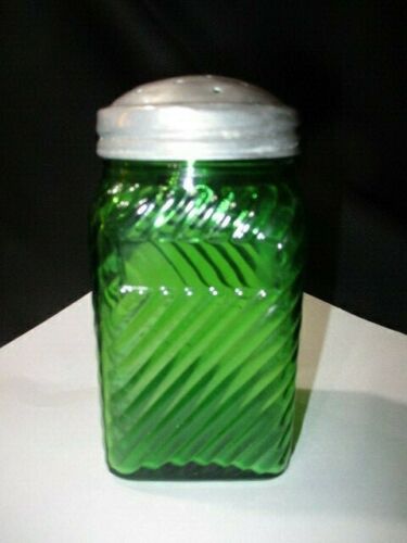 Title (ebay affiliate link): OWENS GREEN DEPRESSION GLASS HOOSIER SHAKER CANISTER ORIGINAL LID SPICE JAR