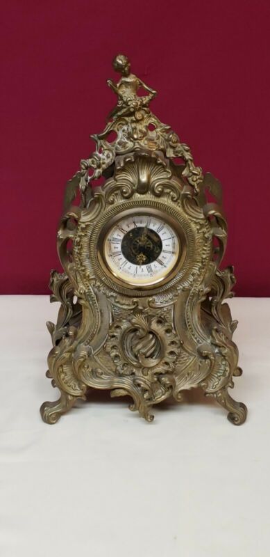 Antique Brass Tone Cast Metal Art Nouveau Mantle Clock 16" tall (FFEB-11-149)
