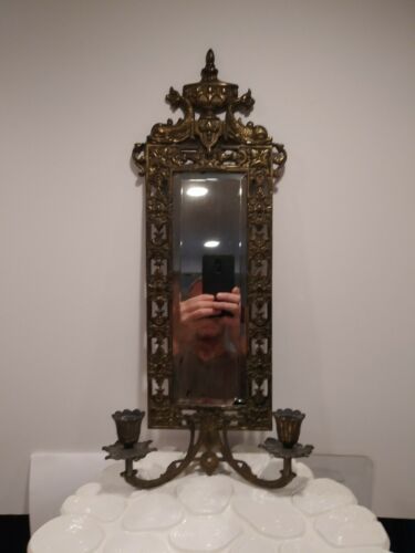 Antique 1800''s ornate gilt bronze brass wall mirror candle holder sconce fixture