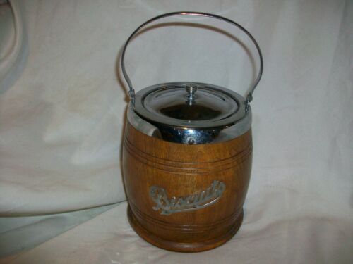 Title (ebay affiliate link): Antique Oak Wood & Metal Biscuit Barrel Cookie Jar Porcelain Liner English