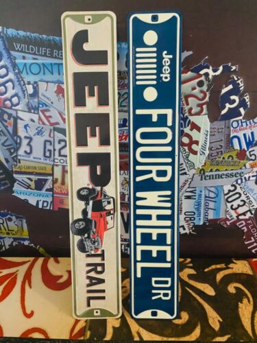 LARGE JEEP TRAIL EMBOSSED METAL JEEP DODGE CAR TRUCK DEALER SHOP SIGNN SET OF 2