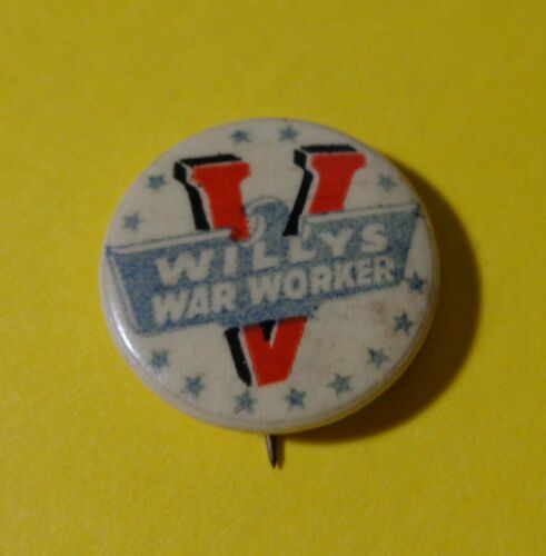 Title (ebay affiliate link): WILLYS WAR WORKER IN EAGLE SHAPED WITH V & STARS BACKGROUND 3/4" pinback button