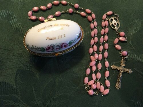 Charming Oval Porcelain Lidded Box with Antique Rosary Pink Milk Glass-Flowers