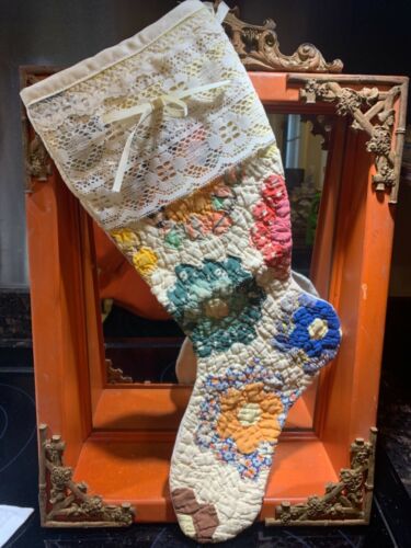 Title (ebay affiliate link): Antique VINTAGE FARM HOUSE CUTTER QUILT STOCKING handmade CHRISTMAS Lace top