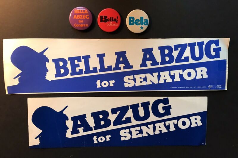 Title (ebay affiliate link): 3 Bella Abzug Political Pinback Buttons & 2 US Senate Stickers