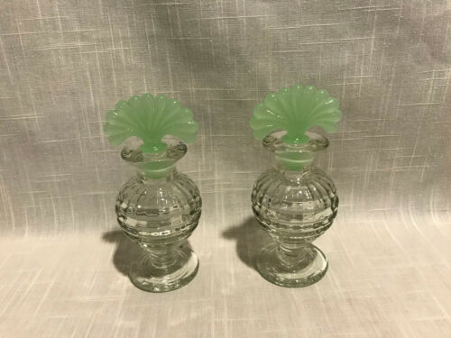 LOT OF (2) GLASS ART DECO PERFUME BOTTLES WITH GREEN FAN TOPS