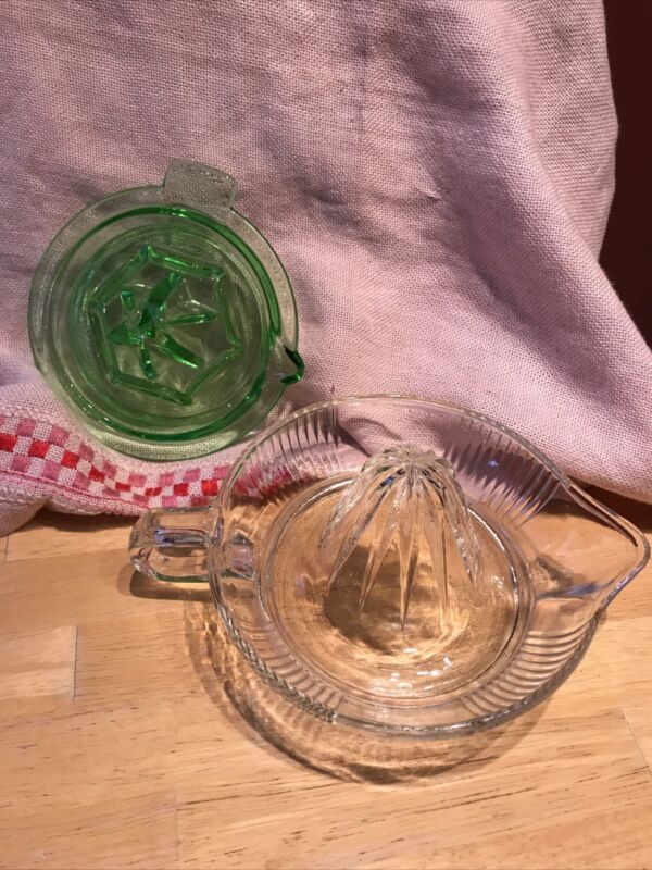 Lot Of 2 Vintage Depression Glass Green And Clear Citrus Reamer Juicer