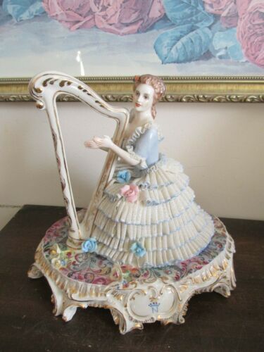 Capodimonte Italy Dresden Lace Lady With Harp Figurine