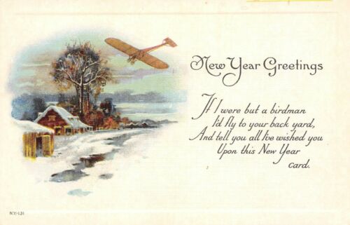 C2401 New Year Greetings Early Airplane Winter Country View Birdman Poem Old PC