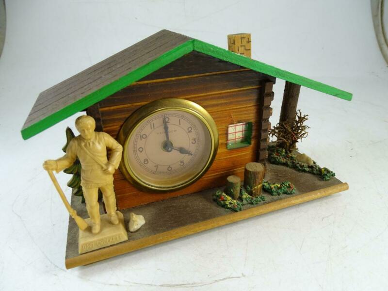 Title (ebay affiliate link): Vintage Heirloom Clock Germany Davy Crockett Wood Mantel Clock Cabin Figural Old