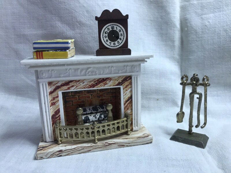 Vtg. Lundby Dollhouse Furniture Fireplace, Fireplace Tools, Mantle Clock, Books