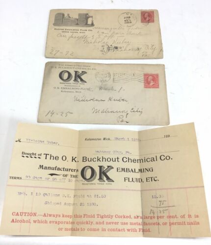 Title (ebay affiliate link): 2 Antique 1898 1900 Embalming Fluid Funeral Coffin Casket Invoice Kalamazoo MI