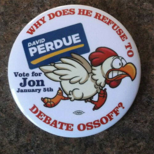 Title (ebay affiliate link): 2021 GEORGIA Democrat JON OSSOFF Senate PERDUE CHICKEN TO DEBATE logo Button