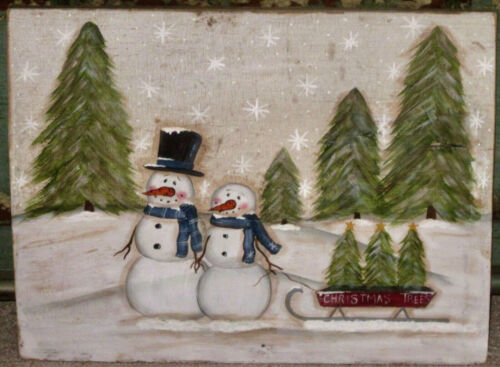 *~*PRIMITIVE*~* HP FOLK ART PRIM SNOWMEN *~* SLED *~* WINTER *~* RECLAIMED WOOD