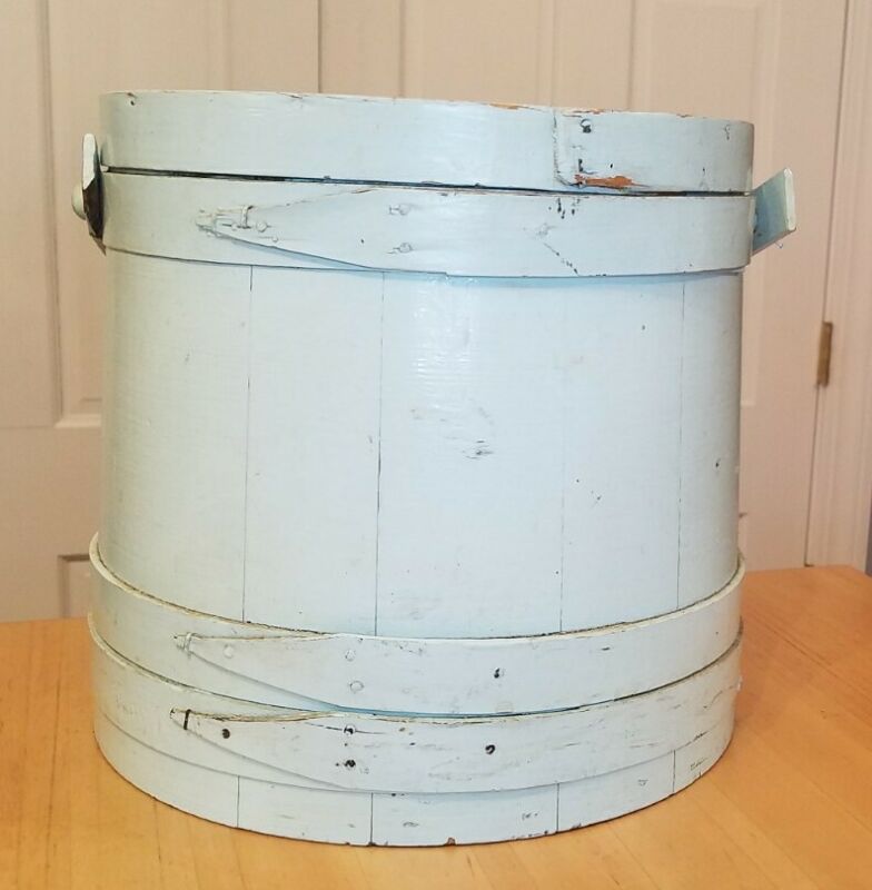 Title (ebay affiliate link): Antique Primitive Wood Firkin Orig Blue Paint Nailed Bands 12" Issue w/ Handle