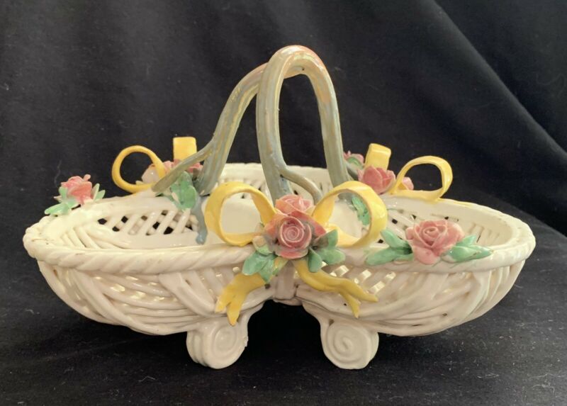 Title (ebay affiliate link): Old Italy White Lattice Porcelain Basket Pink Flowers Yellow Ribbons 3 Sections