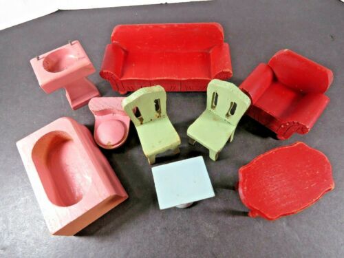 9 pc. Vintage Wooden Mid Century Dollhouse Furniture Lot Bathroom Living B1007