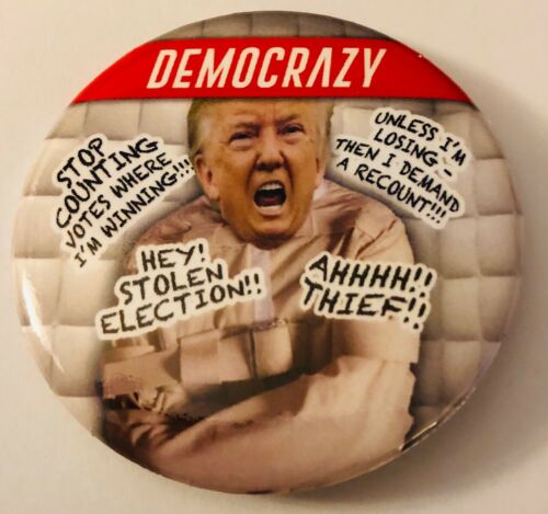 Title (ebay affiliate link): Limited Edition 2 1/4" Anti-Trump "Democrazy" Political Pinback Button