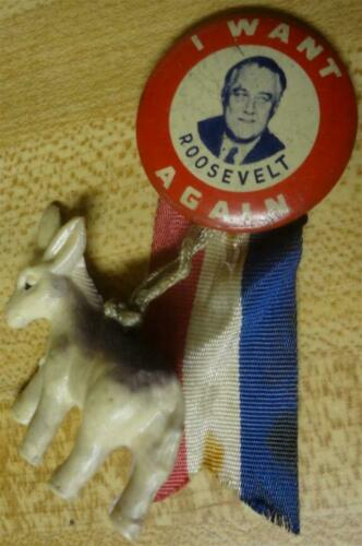 Title (ebay affiliate link): 1936 I WANT ROOSEVELT AGAIN PORTRAIT campaign button w/ RIBBON & DONKEY