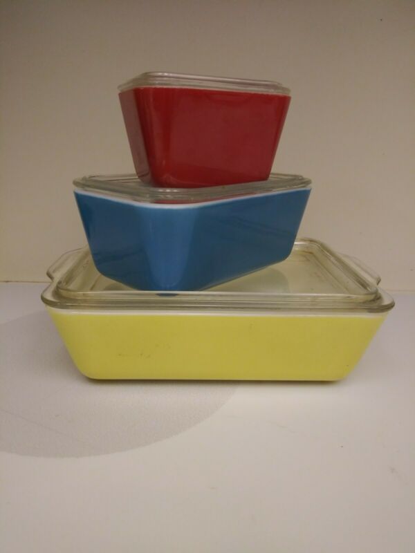 Title (ebay affiliate link): Vintage RED, BLUE & YELLOW PYREX Refirgerater Dish Retro Christmas Holiday