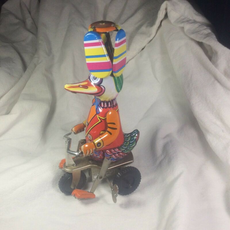 Title (ebay affiliate link): mechanical windup circus duck on tricycle, spinner on top, vintage 1960''s