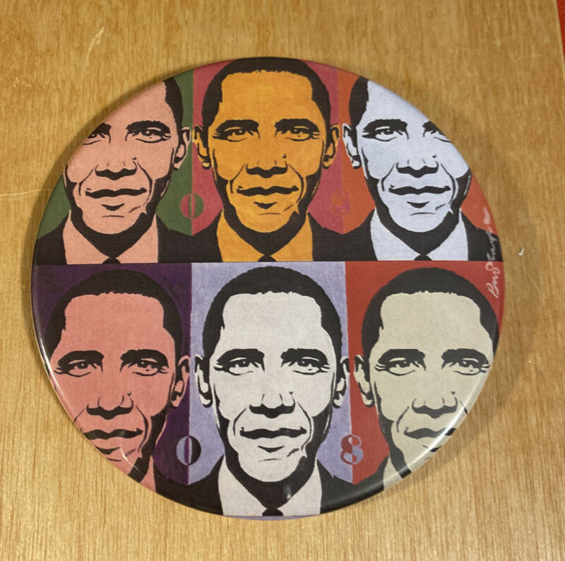 Title (ebay affiliate link): "08" BARACK OBAMA, ANDY WARHOL 4" BUTTON by Brian Campbell