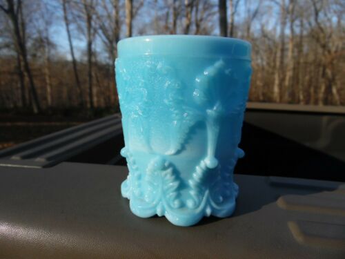 Title (ebay affiliate link): Stunning Ornate Antique Blue Milk Glass Tumbler / Pattern And Maker Unknown