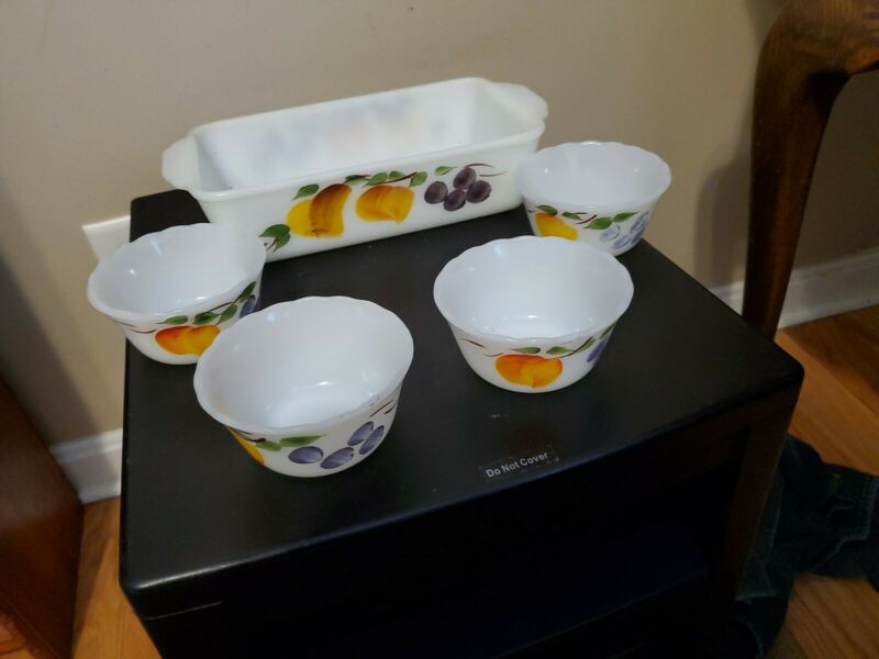 Vintage Fire-King Gay Fad Fruit Loaf Pan /Baking Dish & 4 Custards
