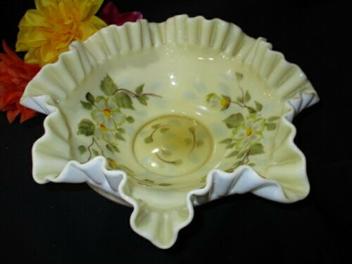 VICTORIAN GLASS BRIDE''S BASKET BOWL BUTTERNUT CREAM CASED MILK GLASS WILD ROSES