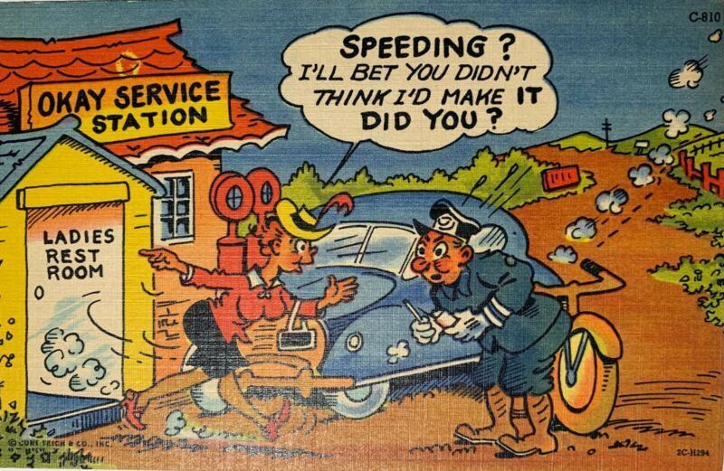 Curt Teich Comic Postcard. Travel . Lady & officer writing ticket at gas station