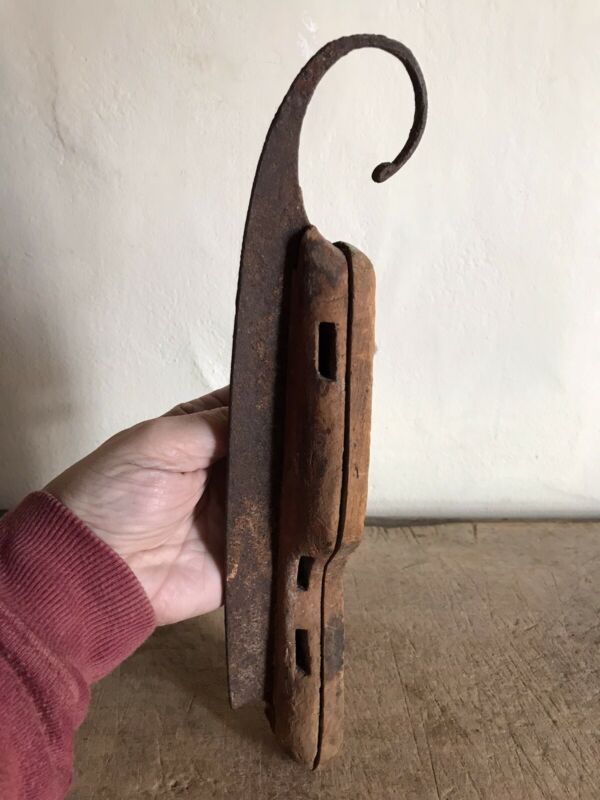 Single Early Antique Handmade Curl Toe Iron Wood Ice Skate Old Red Paint AAFA