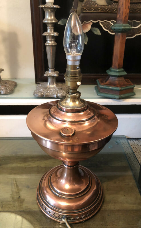 Title (ebay affiliate link): ANTIQUE COPPER OIL/PARAFFIN LAMP WITH BRASS COLLAR - CONVERTED TO ELECTRIC