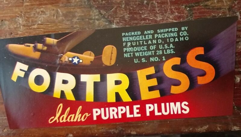 "FLYING" FORTRESS WWII OLD ORIGINAL PLUM CRATE BASKET LABEL FRUITLAND, IDAHO