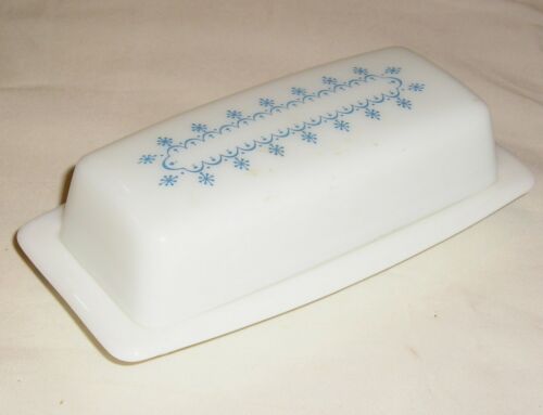 Title (ebay affiliate link): Vintage PYREX Blue Snowflake Garland Butter Dish w/ Cover - Made in USA